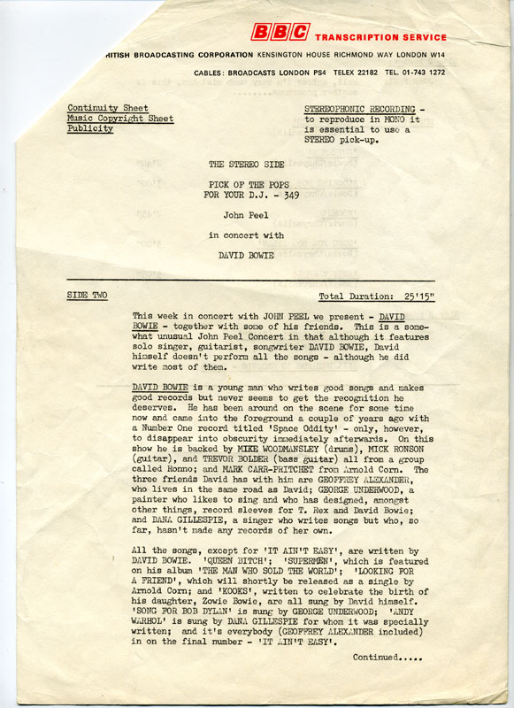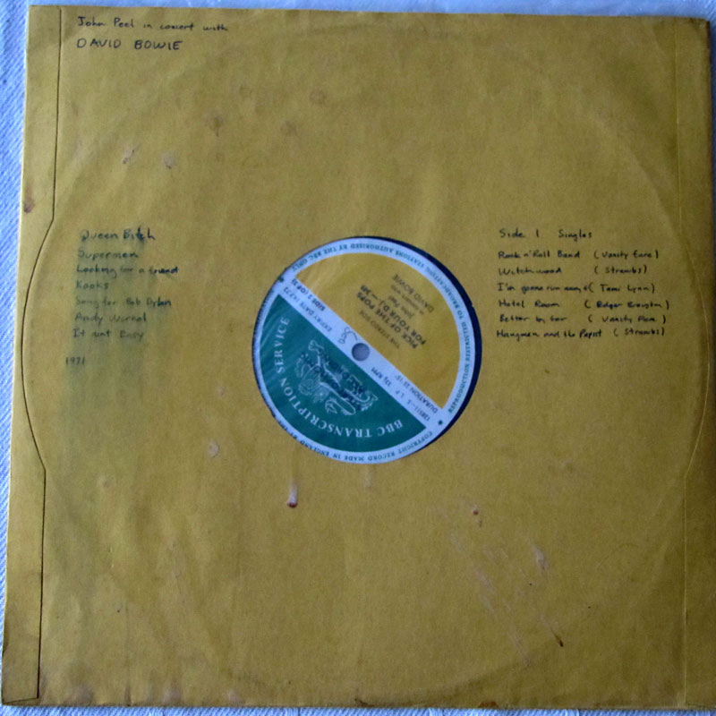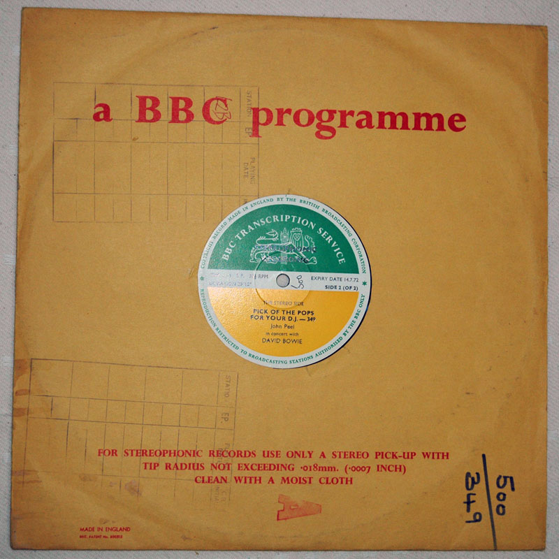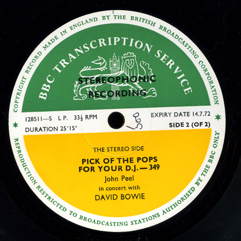 The disc features David Bowie on the "Stereo Side". Several other bands feature on the "Mono Side". The recording opens with a brief introduction by John Peel. The seven songs by Bowie are taken from the "In Concert: John Peel (05-06-71)" session. The label has an expiry date of 14-7-72. The tracks are as follows: