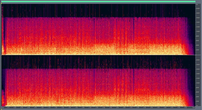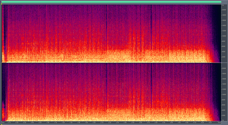 using the Japanese Slow Burn EP as my source, i ripped to wav in EAC to ensure i got an accurate rip. i opened the file in Cool Edit Pro (earlier version of Audacity) and here is the result of a spectral view: